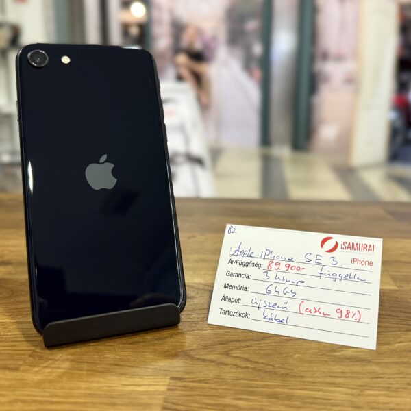 Eladó egy újszerű Apple iPhone SE készülék. 2022-es, 3. generációs, fekete színű, 64 GB belső tárhellyel rendelkezik. Töltőkábellel, valamint 3 hónap iSamurai garanciával. A készülék kártyafüggetlen. Az akkuja 98%-os!