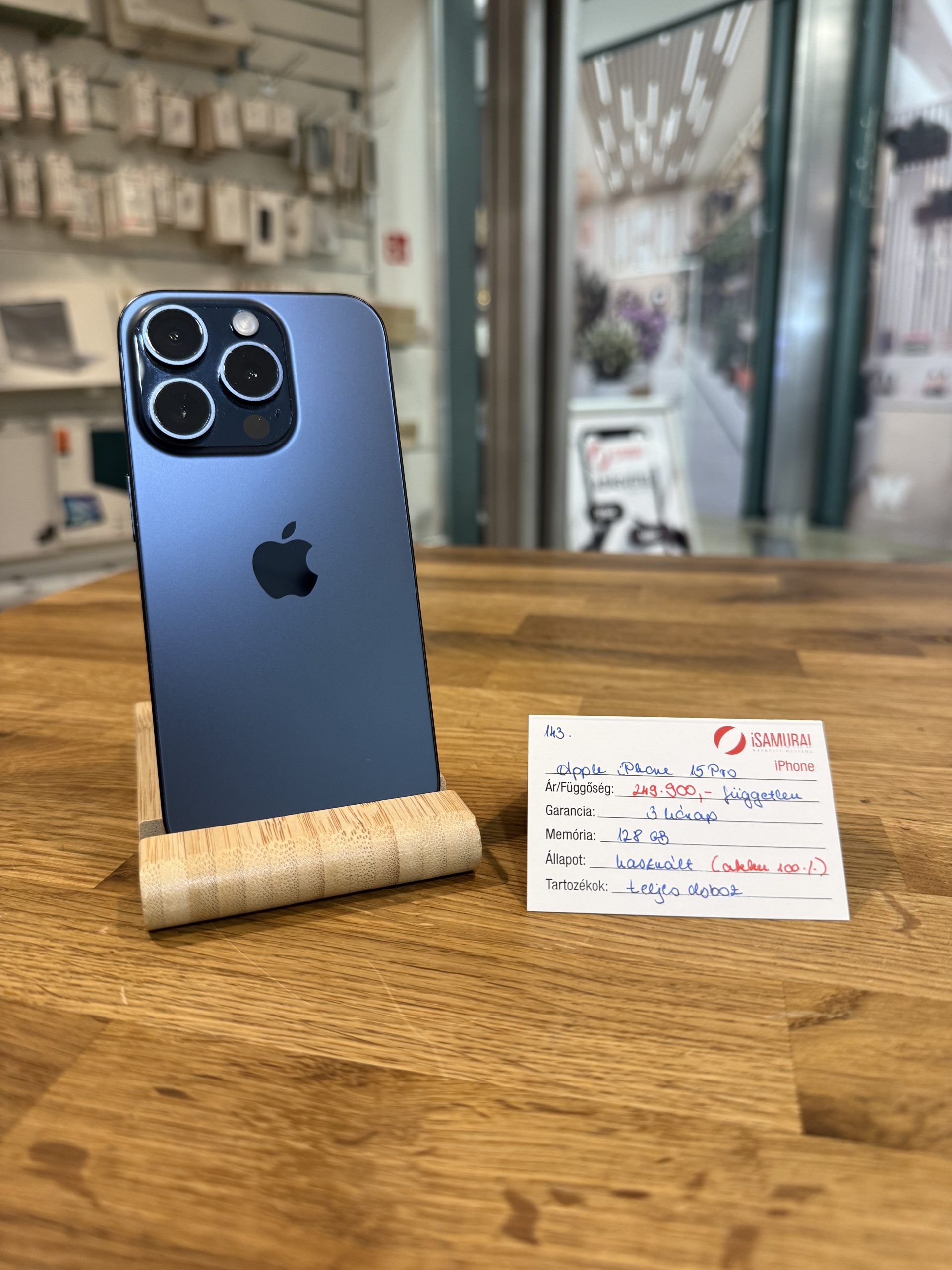 Eladó egy újszerű állapotú Apple iPhone 15 Pro készülék. Kék színben, 128 GB belső tárhellyel. Teljes dobozával, valamint 3 hónapig tartó garanciával. A készülék kártyafüggetlen, bármilyen hálózaton használható. Akkuja 100%-os.