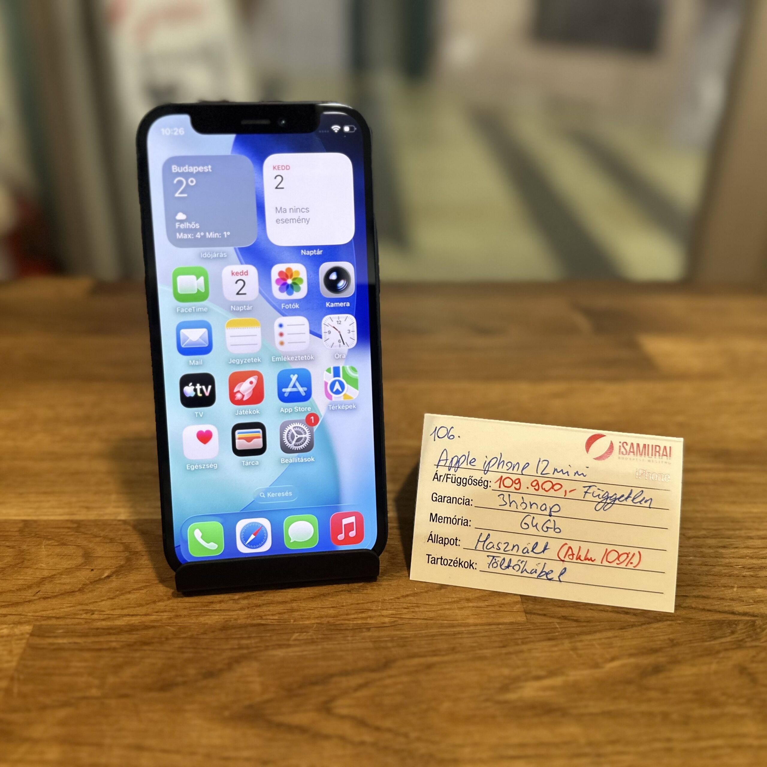 Eladó egy Apple iPhone 12 mini készülék, 64 GB-os belső tárhellyel, fekete színben. Töltőkábellel, valamint 3 hónap iSamurai garanciával. A készülék kártyafüggetlen, így bármilyen hálózaton használható. Az akkuja ÚJ.