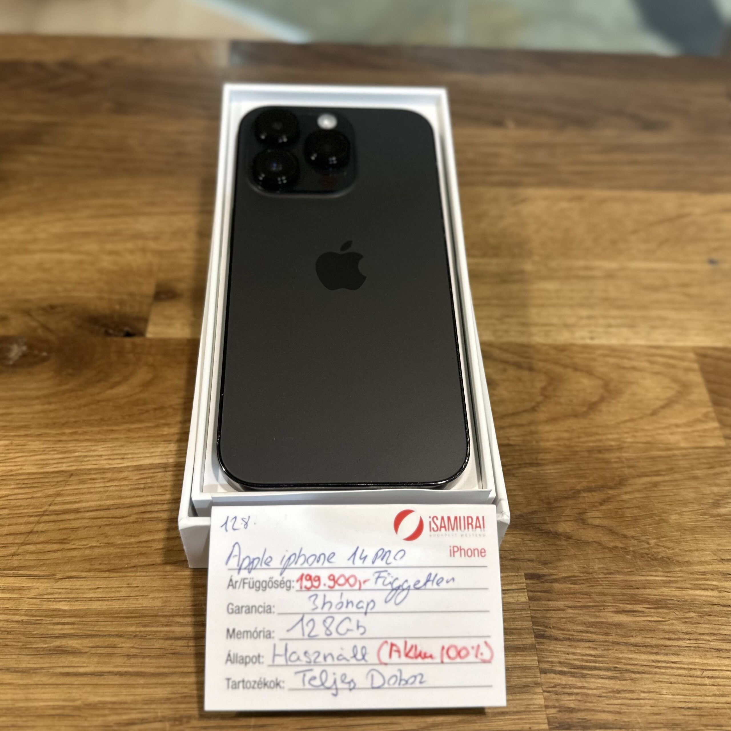 Eladó egy használt Apple iPhone 14 Pro készülék. Fekete színben, 128 GB belső tárhellyel. Dobozában töltőkábellel, valamint 3 hónap garanciával. A készülék kártyafüggetlen, bármilyen hálózaton használható. Akkuja, 100%-os.