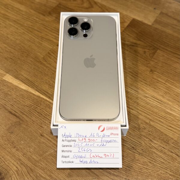 Eladó egy újszerű karcmentes Apple iPhone 16 Pro Max készülék, 256 GB belső tárhellyel, natúr titán színben. A készülék kártyafüggetlen, így bármilyen hálózaton használható. Dobozában, töltőkábellel, valamint 2026.11.05.- ig Apple garanciával. A készülék akkuja 94%-os.