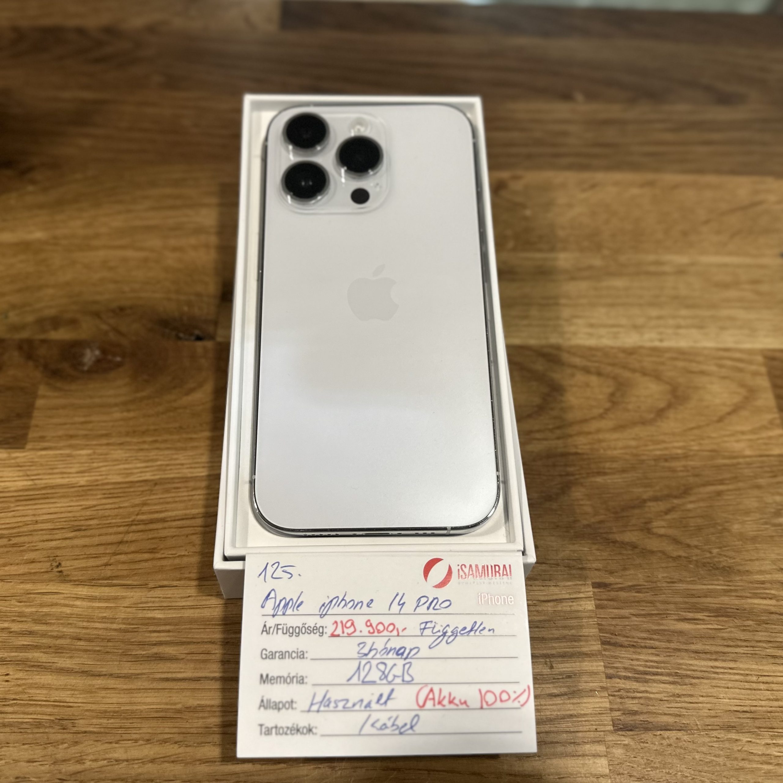 Eladó egy újszerű Apple iPhone 14 Pro készülék. Ezüst színben, 128 GB belső tárhellyel. Töltőkábellel, valamint 3 hónap iSamurai garanciával. A készülék kártyafüggetlen, bármilyen hálózaton használható. A készülék akkuja 100%-os