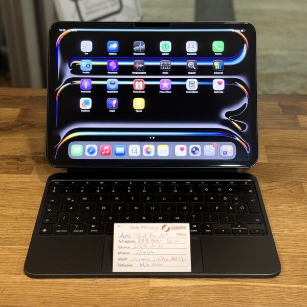 Eladó egy újszerű Apple iPad Pro 11″ készülék. Legújabb, Wi-Fi-s modell, M4 chippel, 256 GB belső tárhellyel. Dobozában összes gyári tartozékával és számlájával, valamint 2027.10.14.-ig Apple garanciával. A gép akkuja 100%-os. Újszerű, magyar nyelvű Magic Keyboard megvásárolható hozzá 119900.- forintos áron és Pencil Pro 39.900.- forintos áron.