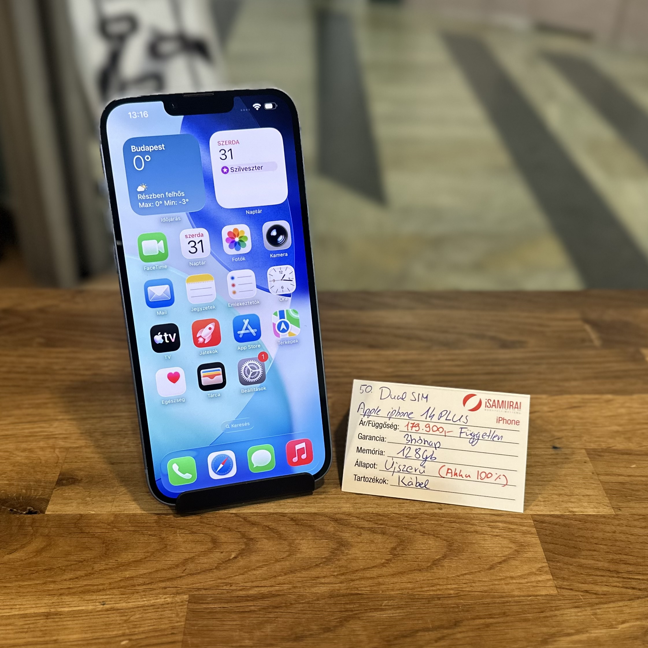 Eladó egy újszerű Apple iPhone 14 Plus készülék. Kék, 128 GB belső tárhellyel. Töltőkábellel, valamint 3 hónap garanciával. A készülék kártyafüggetlen, bármilyen hálózaton használható. A telefon DUAL SIMES. Akkuja új 100%-os.