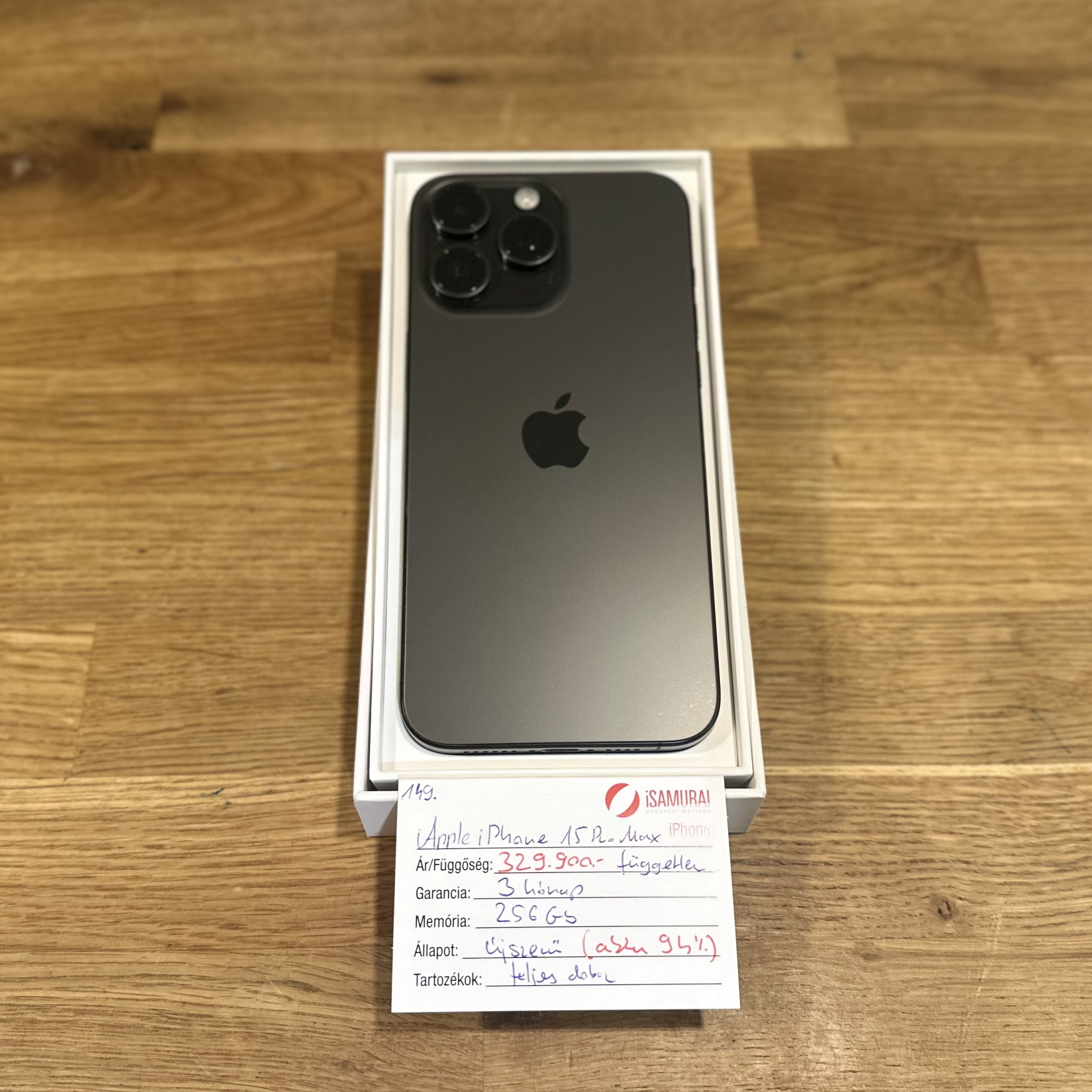 Eladó Apple iPhone 15 Pro Max készülék. Fekete Titán színben, 256 GB belső tárhellyel. Dobozzal, valamint 3 hónap iramurai garanciával. A készülék kártyafüggetlen, bármilyen hálózaton használható.