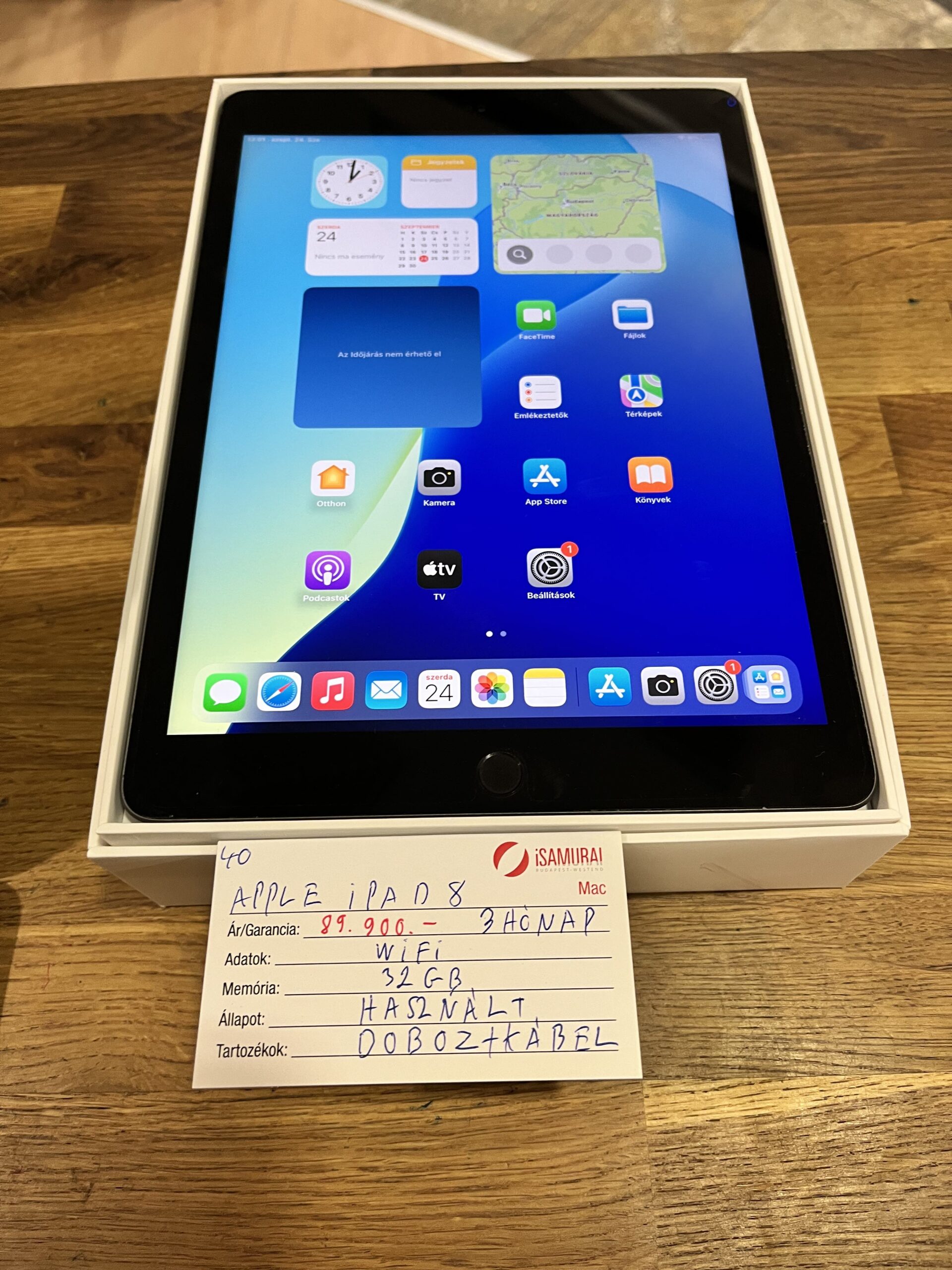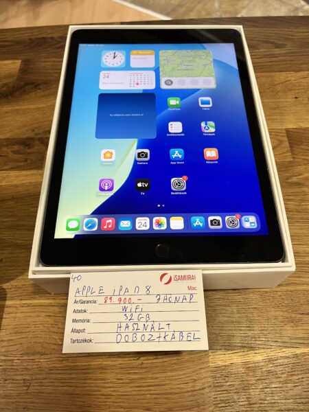 Eladó egy újszerű állapotban lévő Apple iPad 8. generációs készülék. Wifi-s modell. 10,2″ hüvelykes kijelzővel, asztroszürke színben, 32 GB belső tárhellyel. Töltőkábellel, valamint 3 hónap iSamurai garanciával.