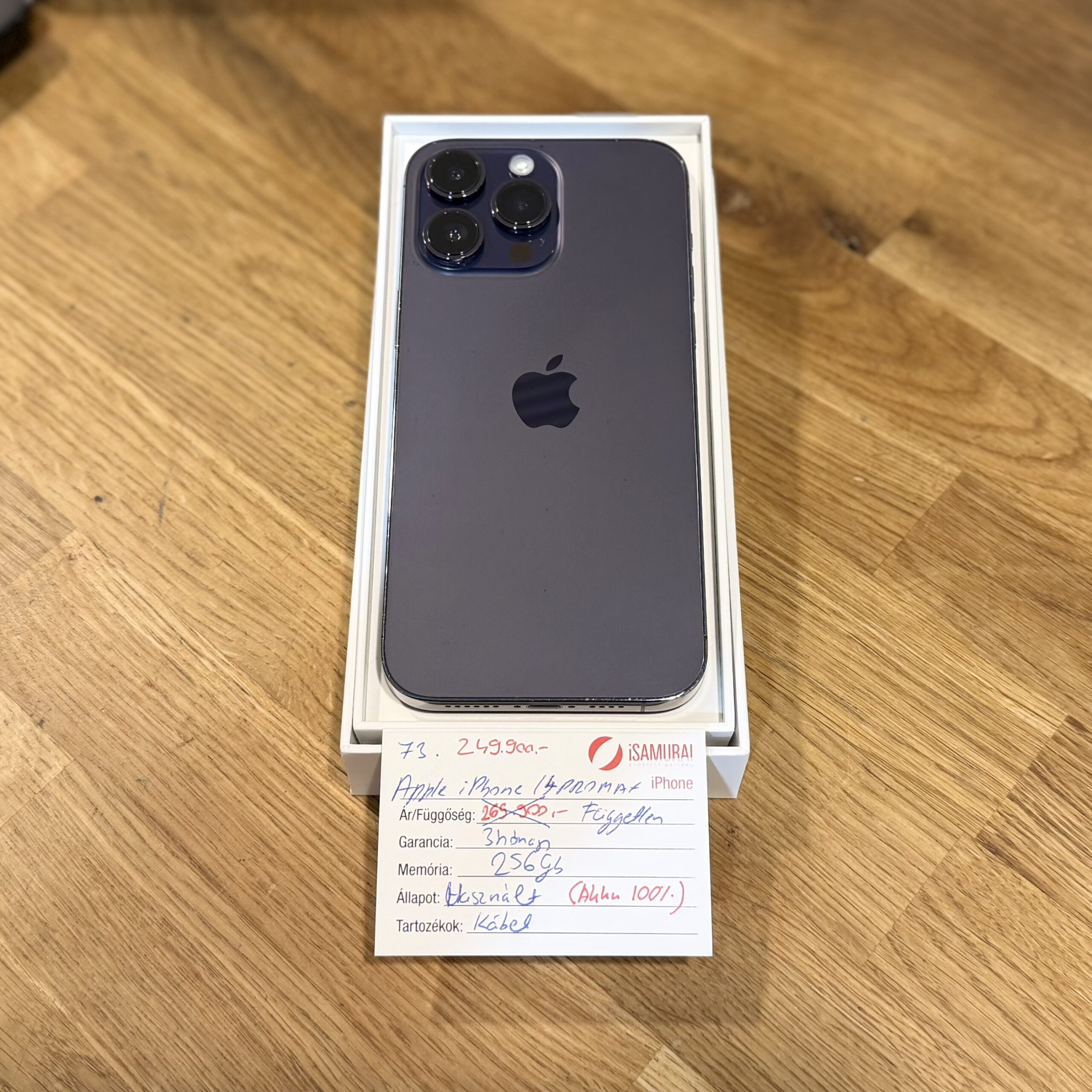 Eladó egy Apple iPhone 14 Pro Max készülék. Lila színben, 256 GB belső tárhellyel. Dobozában töltőkábellel, valamint 3 hónap garanciával. A készülék kártyafüggetlen, bármilyen hálózaton használható. Akkuja 100%-os.