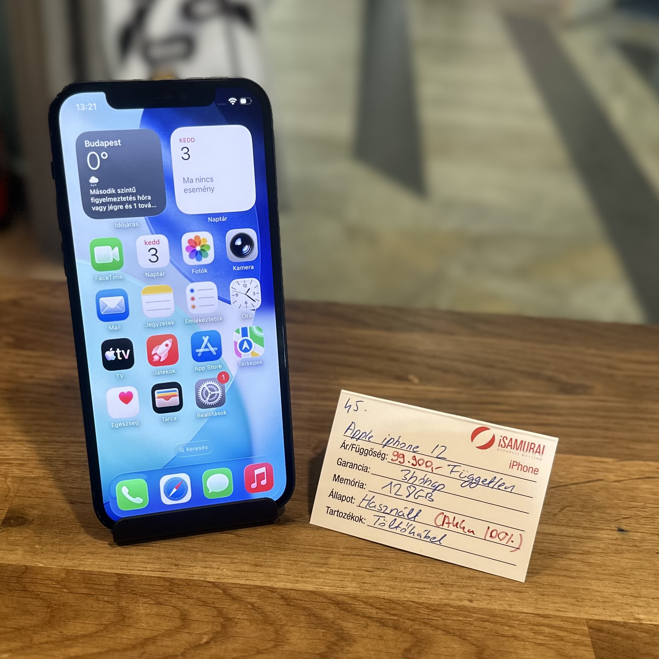Eladó egy Apple iPhone 12 készülék, 128 GB-os belső tárhellyel, fekete színben. Töltőkábellel, valamint 3 hónap iSamurai garanciával. A készülék kártyafüggetlen, így bármilyen hálózaton használható. Az akkuja ÚJ!